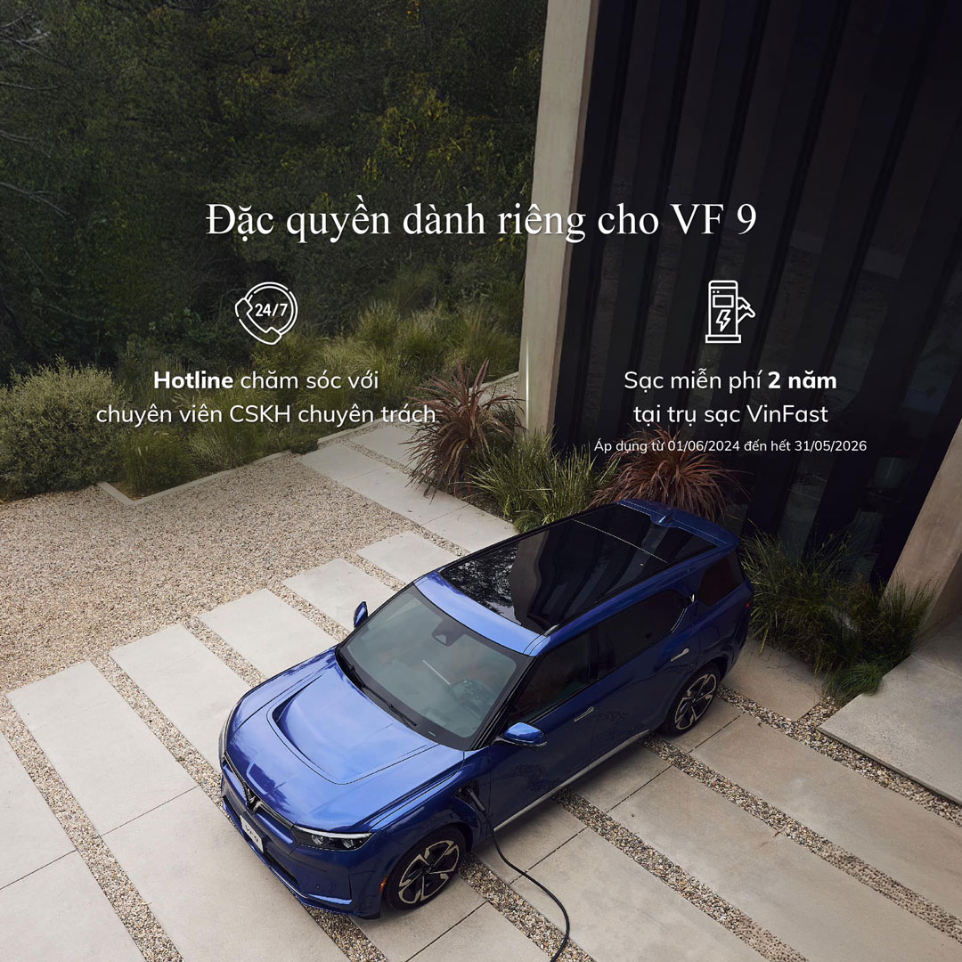 - Đối với các Khách hàng mua VF 9 kể từ ngày 01/06/2024, VinFast cam kết mua lại xe VF 9 với mức giá 78% sau 24 tháng và 70% sau 36 tháng tính theo giá xuất hóa đơn.