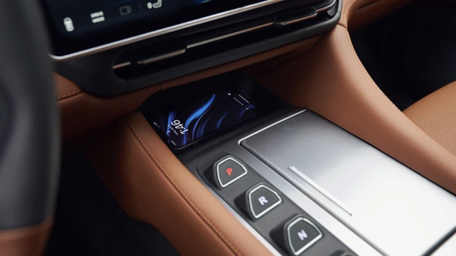 Nút chuyển số trực quan, kèm sạc không dây tích hợp trên bệ tì tay, tiện lợi và dễ dàng sử dụng.